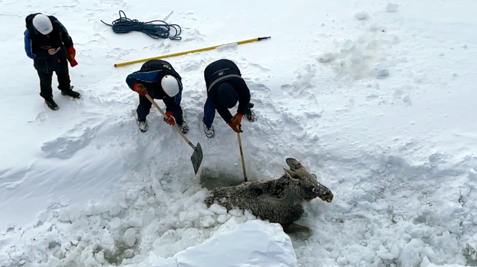 На помощь животному вышли старший помощник капитана Виталий Менгден, боцман Антон Скорб и матрос Анатолий Кононов. Сначала лосиху откопали лопатами, а после привлекли кран.
