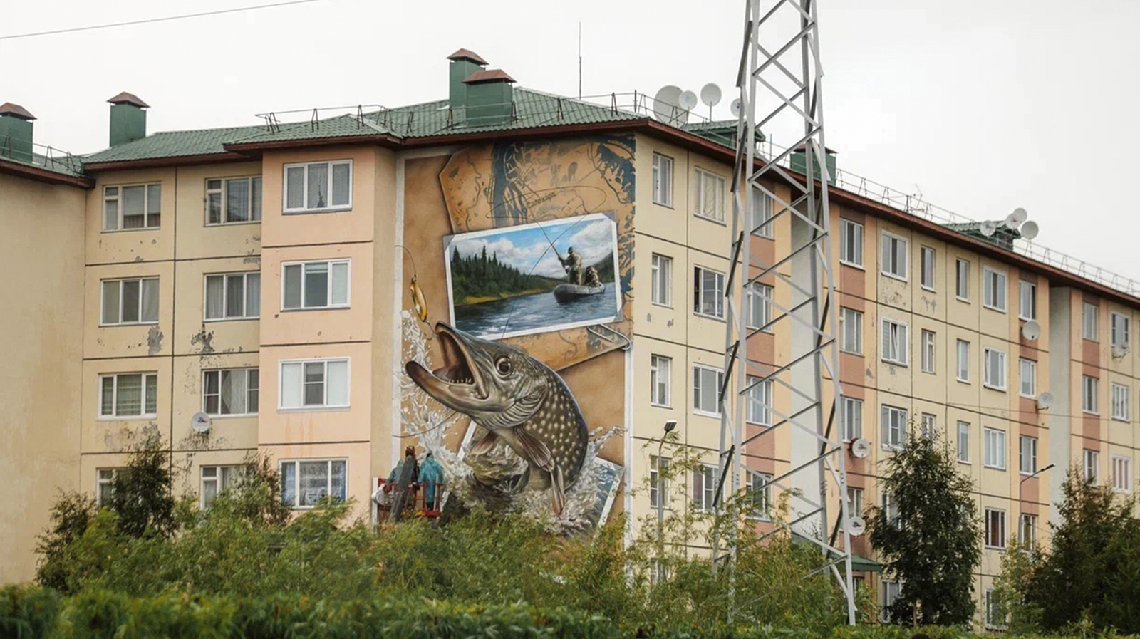 В Салехарде появился мурал с огромной щукой, воспевающий традиции северного рыболовства. Проект воплотили художники из Москвы.