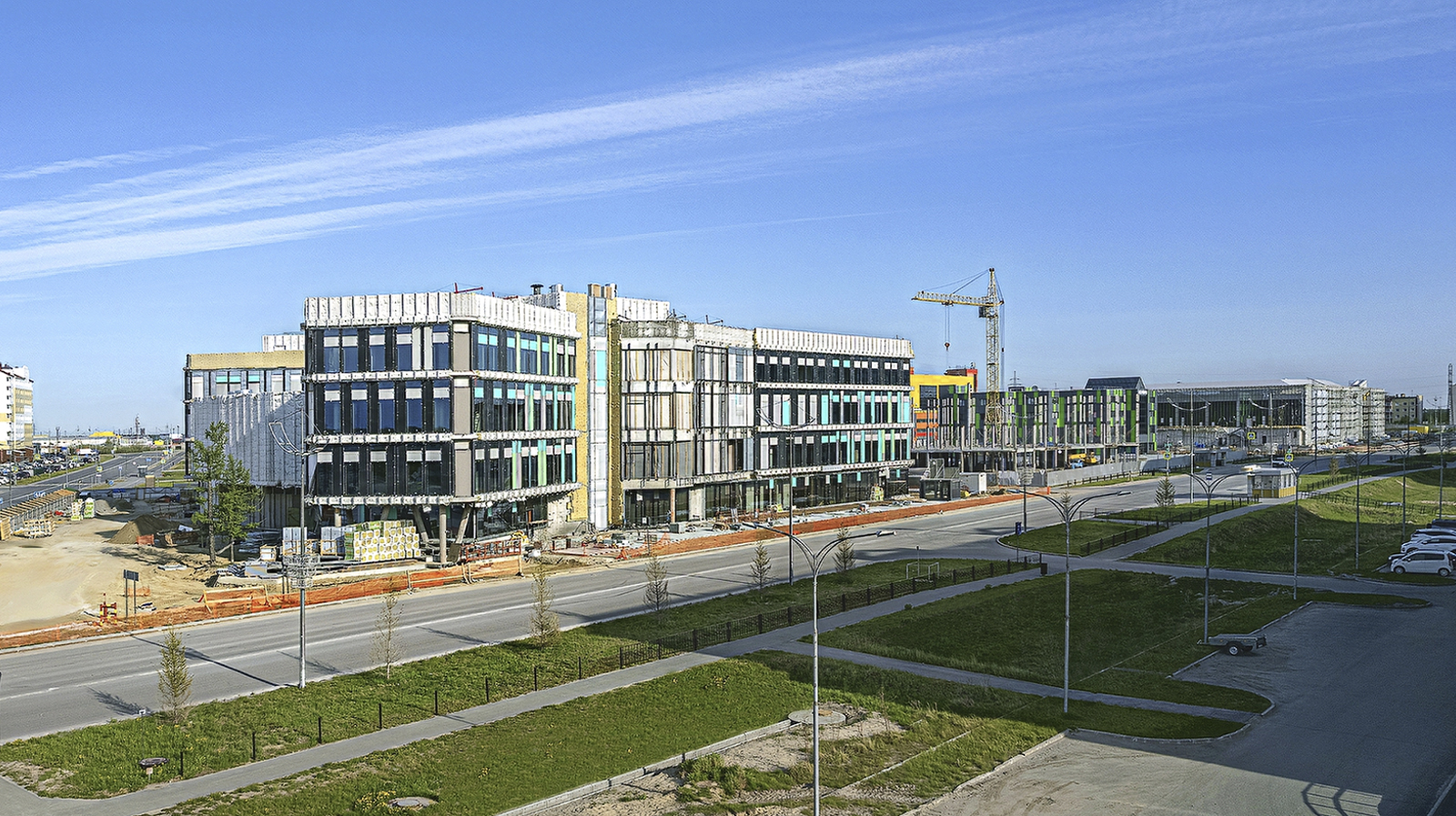 Здание школы отличается уникальной архитектурой и сложной планировкой. На данный момент ведутся работы по утеплению фасада, монтажу витражных конструкций, завершается устройство кровли, выполнены внутренние перегородки, ведется отделка помещений и монтаж инженерных сетей. Параллельно строители приступили к благоустройству прилегающей территории.