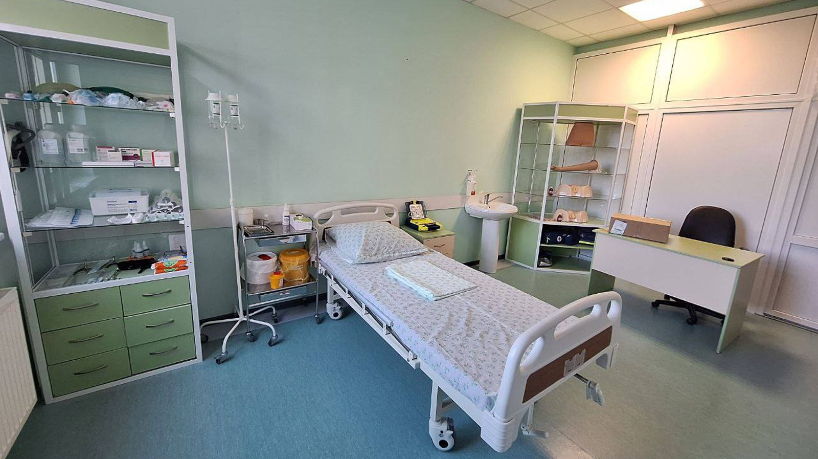 Учебная палата и процедурный кабинет оснащены высокореалистичными манекенами, которые заменяют пациентов. Студенты и медсёстры могут безопасно и максимально приближено к реальным условиям отрабатывать навыки, такие как постановка катетеров, инфузии, инъекции и оказание первой помощи.